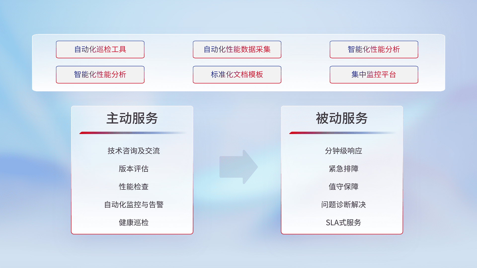 智能化工具和标准化文档,,保障服务质量,,提供主动服务(包含技术咨询、、、版本评估、、、性能检查、、自动化监控与告警、、健康巡检)和被动服务包含(分钟级响应、、、、紧急排障、、、、值守保障、、、、问题诊断解决、、SLA服务)。。。。
